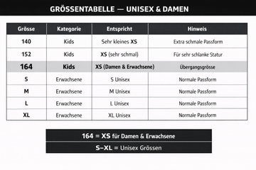 Grösse 164 entspricht XS für Damen und Erwachsene.